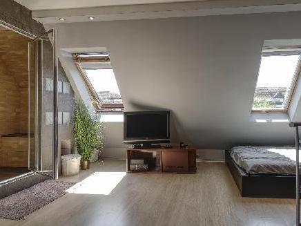 A tetőtérben egylégtérben egy klímával ellátott garzonlakás található.